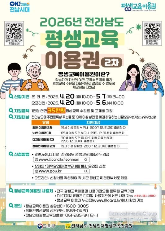 시민행정신문 강갑수 기자 | 순천시는 시민의 평생학습 기회 확대와 교육격차 해소를 위해 ‘2026년 전라남도 평생교육이용권’ 2차 신청 접수를 20일부터 시작한다고 밝혔다.