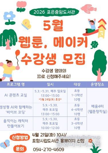 시민행정신문 강갑수 기자 | 포항시립포은중앙도서관은 오는 21일 오전 10시부터 ‘2026년 5월 웹툰·메이커 프로그램’ 수강생을 선착순 모집한다.