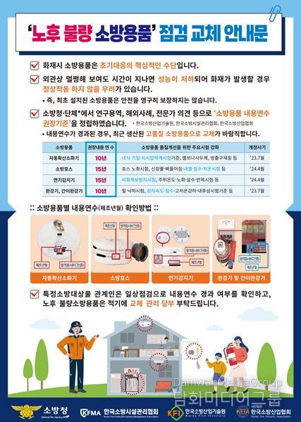 관계인은 평소 자체점검 과정에서 제품의 제조연월과 형식승인 표시 등을 확인해 내용연수 경과 여부를 살피고, 외관 손상이나 변형, 누수, 감지 이상 등 기능 저하 징후도 꼼꼼히 점검해야 한다. 특히 권장 내용연수가 지난 제품이나 노후화가 우려되는 소방용품은 최근 강화된 품질기준을 통과한 제품으로 교체하는 것이 바람직하다.