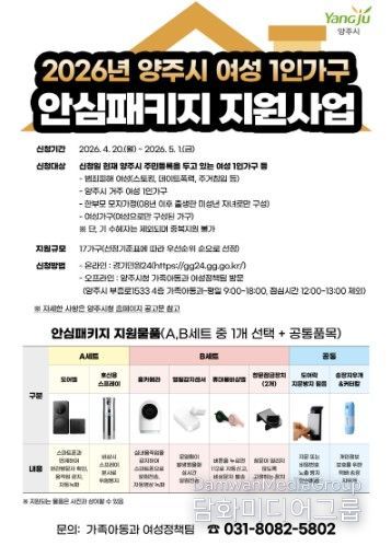 시민행정신문 강갑수 기자 | 양주시는 관내 여성 1인 가구 등 범죄 취약 여성 가구의 안전한 일상을 지원하기 위해 ‘2026년 양주시 여성 1인 가구 안심패키지 지원사업’을 추진한다.
