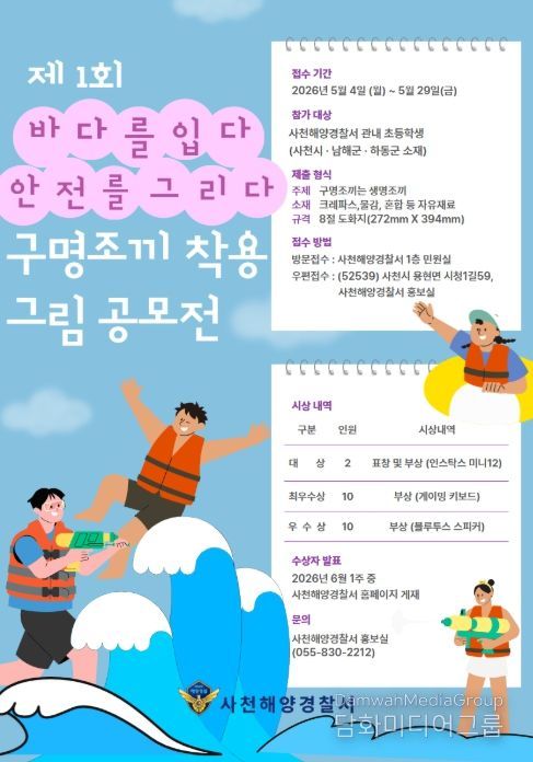 시민행정신문 이존영 기자 | 사천해양경찰서는 제1회 '바다를 입다 안전을 그리다' 구명조끼 착용 그림 공모전을 개최한다고 20일(월) 밝혔다.