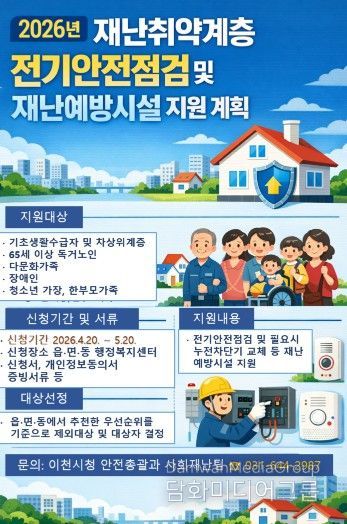 이천시 관계자는 “재난취약계층이 더욱 안전한 환경에서 생활할 수 있도록 사전 예방 중심의 안전점검과 재난예방시설 지원을 지속적으로 추진하겠다”라며 “지원이 필요한 대상자들이 기간 내 빠짐없이 신청하시길 바란다”라고 말했다.