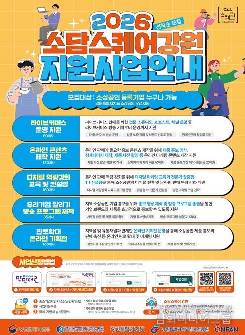 시민행정신문 이세훈 기자 | 디지털커머스 전문기관 ‘소담스퀘어 강원’이 도내 소상공인의 성공적인 온라인 시장 진출과 디지털 전환을 돕기 위해 ‘2026년도 지원사업’ 참여 업체를 지난 13일부터 연중 상시 모집 중이라고 밝혔다.