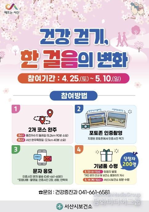 김용란 서산시보건소장은 “걷기는 누구나 쉽게 실천할 수 있는 가장 효과적인 신체활동”이라며 “지난해에 이어 마련한 이번 행사에 많은 시민이 참여해 봄 길을 걸으며 건강도 챙기시길 바란다”라고 말했다.
