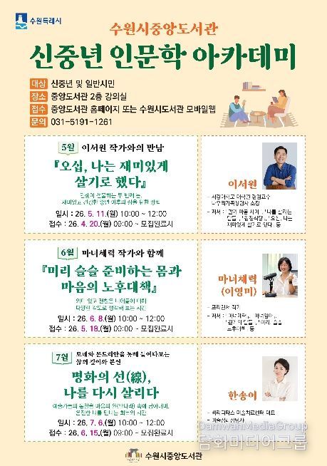 시민행정신문 강갑수 기자 | 수원시 중앙도서관이 5월부터 7월까지 매달 1회 운영하는 ‘신중년 인문학 아카데미’ 수강생을 모집한다.