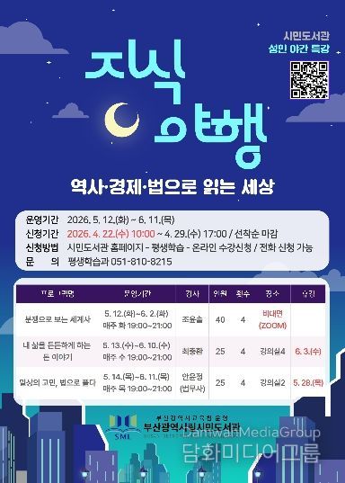 시민행정신문 기자 | 부산광역시립시민도서관은 오는 5월 12일부터 6월 11일까지 낮 시간 도서관 이용이 어려운 성인 90명을 대상으로 도서관 강의실과 온라인(ZOOM)을 통해 ‘지식 야행’특강을 운영한다.