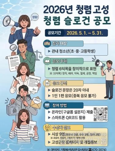 이번 공모전은 관내 청소년의 청렴 의식을 높이고, 미래세대 중심의 청렴문화를 지역 사회에 확산하기 위해 마련됐다.