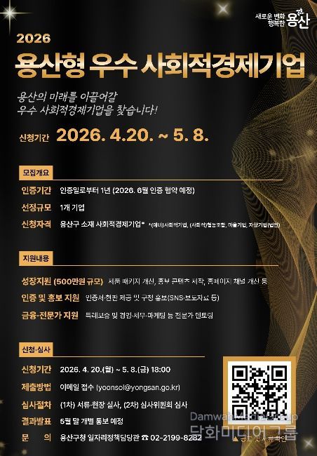 박희영 용산구청장은 “이번 사업은 지역사회에 기여한 사회적경제기업의 성과를 공식적으로 인정하고 성장 기반을 마련하기 위한 것”이라며 “앞으로도 구민과 함께 성장하는 사회적경제 생태계 조성을 위해 다양한 지원을 이어가겠다”고 말했다.