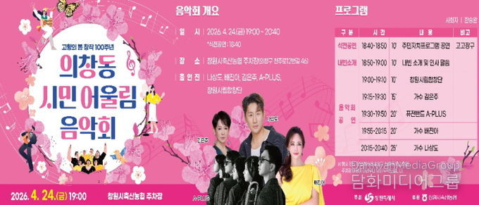 시민행정신문 기자 | 창원특례시는 오는 24일 19시 창원시축산농협 주차장(의창구 중동 402-2)에서 ‘의창동 시민 어울림 음악회’를 개최한다고 밝혔다.