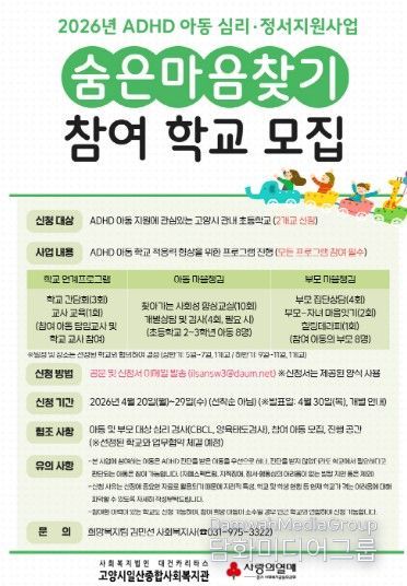 시민행정신문 강갑수 기자 | 고양시일산종합사회복지관은 ADHD 아동의 학교 적응을 돕기 위한 심리·정서지원사업 ‘숨은마음찾기’에 참여할 학교를 모집한다고 21일 밝혔다.