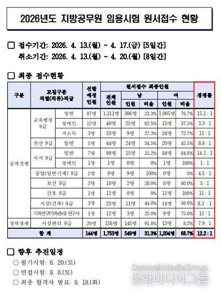 시민행정신문 기자 | 부산광역시교육청은 지난 13일부터 17일까지 실시한 ‘2026년도 지방공무원 임용시험’ 원서접수 결과 144명 선발에 1,753명이 지원해 평균 12.2대 1의 경쟁률을 보였다고 밝혔다.