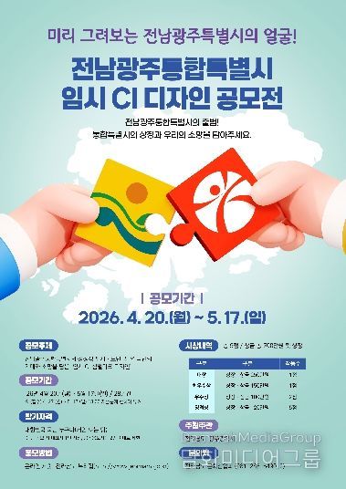 시민행정신문 강갑수 기자 | 전라남도와 광주광역시는 통합특별시의 상징성을 나타내는 전남광주통합특별시 임시 CI 디자인을 5월 17일까지 28일간 전국민을 대상으로 공모한다고 밝혔다.
