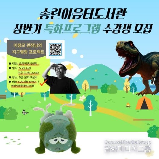 해당 특강 수강생 모집은 4월 20일 10시부터 화성시통합예약시스템(검색어: “지구멸망”)으로 이뤄지며, 대상은 초등학생이며 수강생의 정보로 입력해야 접수할 수 있다.
