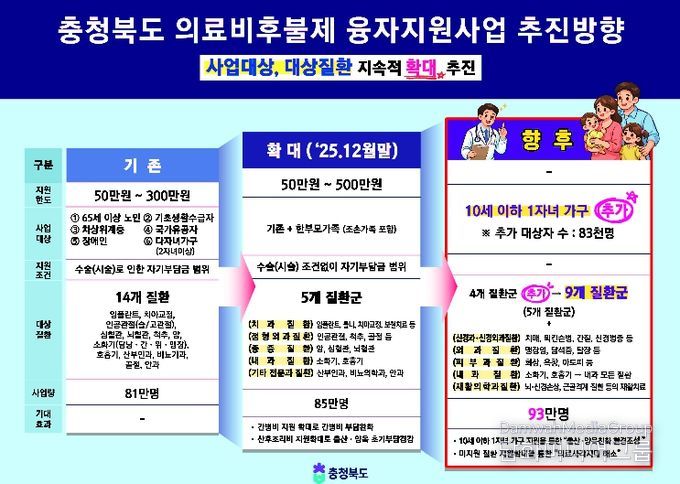 충청북도는 여기에서 더 나아가 지원 대상을 10세 이하 자녀를 둔 한 자녀 가정까지 확대하고, 신경과·외과·피부과·재활의학과 등 4개 질환군을 추가해 기존 5개 질환군에서 총 9개 질환군으로 확대할 계획이다. 이를 통해 보다 촘촘하고 빈틈없는 지원체계를 구축한다는 방침이다.