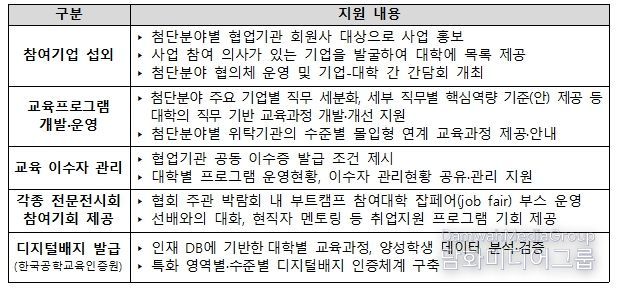 분야별 협업기관은 △참여기업 섭외, △교육프로그램 개발 및 운영, △교육 이수자 관리, △각종 전문 전시회 참여기회 제공 등 사업 운영의 전 단계에서 대학-기업의 교류를 활성화하고, 학생들을 지원하는 역할을 한다. 또한, 대학별 교육과정을 분석하여, 특화 영역별·수준별 디지털 배지 발급을 지원하는 등 인증 체계를 구축하기도 한다.