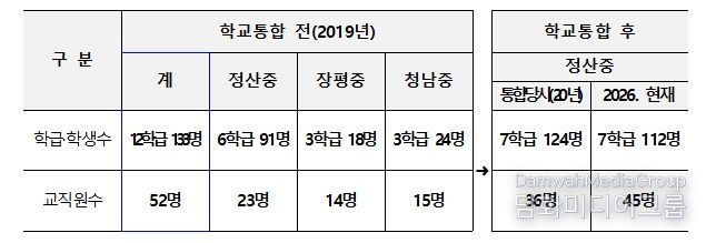 정산중학교는 1952년 개교 이후, 2020년 인근 청남중학교와 장평중학교를 통합해 기숙형 중학교로 재편·운영 중이다. 해당 학교는 통합 후 우수한 교육환경을 바탕으로 체계적인 교육과정을 운영하고 다양한 교육 프로그램을 제공함으로써 작은학교 혁신의 대표적 우수사례로 평가받고 있다.