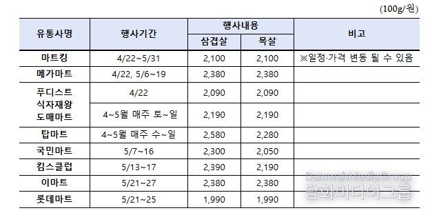오프라인 할인행사는 전국 8개 마트에서 4월 22일부터 5월 31일까지 한돈 삼겹살, 목살을 최대 30% 이상 할인된 가격에 판매한다.