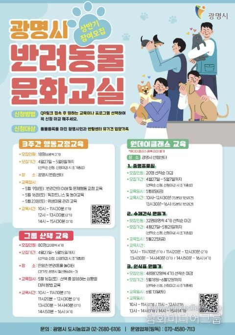 행동교정교육은 5월 9일부터 3주간 광명시 반함센터에서 진행하며, 반려견 이해와 문제행동 교정, 놀이, 위생관리 등을 단계별로 배울 수 있다.