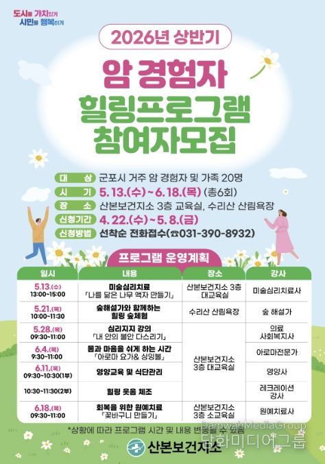 시민행정신문 기자 | 군포시 산본보건지소는 오는 5월 13일부터 6월 18일까지 총 6회에 걸쳐 암 경험자와 그 가족 20여 명을 대상으로 암 경험자 자조모임인 ‘봄·봄·봄 프로그램’을 운영한다.