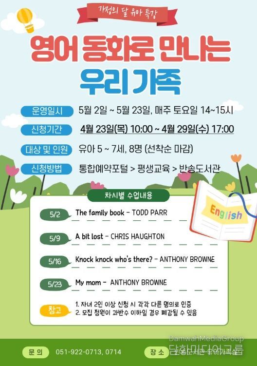 시민행정신문 기자 | 부산광역시립반송도서관은 다음달 2일부터 23일까지 매주 토요일마다 도서관 유아가족실에서 5~7세 유아 8명을 대상으로 가정의 달 유아 특강 ‘영어 동화로 만나는 우리 가족’을 운영한다.