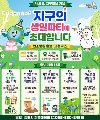 시민행정신문 김학영 기자 | 김해시는 지구의 날(4.22)을 기념한 제18회 기후변화주간을 맞아 오는 25일 오전 10시부터 오후 3시까지 연지공원에서 탄소중립 체험 행사‘지구의 생일파티에 초대합니다’를 운영한다고 22일 밝혔다.