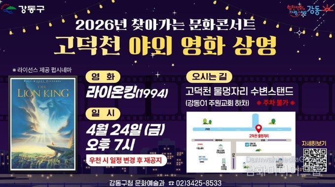 시민행정신문 이존영 기자 | 서울 강동구는 오는 24일 오후 7시, 고덕천 물멍자리 수변스탠드(주원교회 맞은편)에서 ‘2026년 찾아가는 문화콘서트’ 3회차 프로그램으로 미디어파사드를 활용한 야외 영화 상영을 진행한다고 밝혔다.