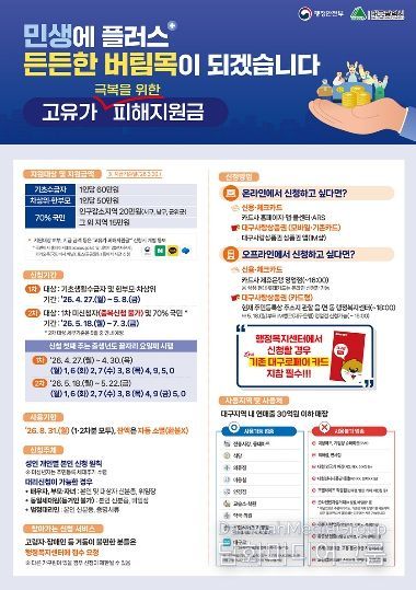김정기 대구광역시장 권한대행 행정부시장은 “중동전쟁으로 인한 고유가·고물가로 지역경제 소비심리가 크게 위축됐다”며 “민생 안정이 최우선인 만큼, 시민분들께서 신청 단계부터 지급·사용까지 불편함이 없도록 만반의 준비를 다하겠다”고 말했다.