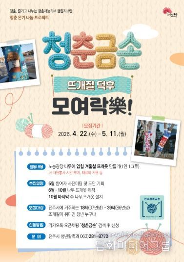 시민행정신문 강갑수 기자 | 전주시는 전주지역 청년들이 취미와 재능을 나누며 지역사회와 소통하는 ‘청춘 재능기부 챌린지’의 제3탄인 ‘청춘 금손(뜨개질 덕후) 모여락(樂)!’을 추진한다고 22일 밝혔다.