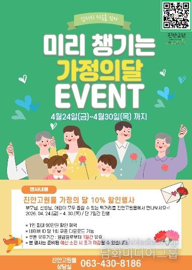 진안군 관계자는 “가족과 주변 지인들에게 따뜻한 마음을 전하는 가정의 달인 만큼, 진안고원이 키워낸 건강한 먹거리로 감사의 인사를 전하시길 바란다”며 “앞으로도 진안고원몰을 통해 생산자와 소비자가 상생할 수 있는 다양한 프로모션을 지속적으로 추진하겠다”고 말했다.