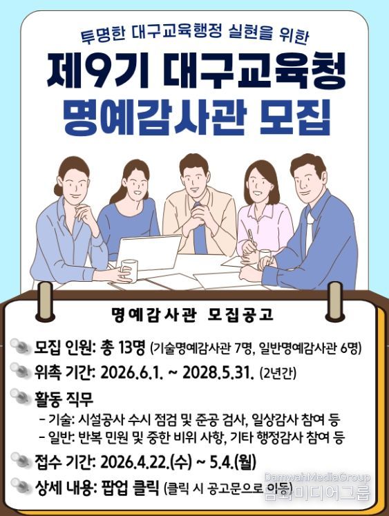 시민행정신문 기자 | 대구시교육청은 시민 참여를 통해 감사의 공정성과 투명성을 높이기 위해 ‘제9기 명예감사관’ 13명을 공개 모집한다고 밝혔다.