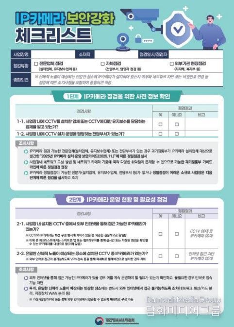 이에 개인정보위는 소규모 사업장 등에서 이행할 수 있는 ‘IP카메라 점검 체크리스트’를 마련한다. 또한, 관계부처(문화체육관광부, 보건복지부 등), 지방자치단체, 주요 직능단체 등과 협력하여 공공시설물, 의료기관, 소규모 사업장(헬스장, 노래방 등) 등에 대한 IP카메라 자율점검 및 보안조치 이행을 적극 추진한다.
