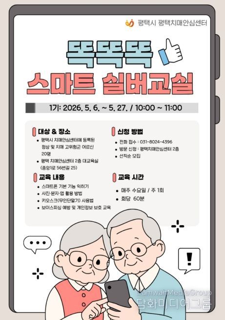 시민행정신문 기자 | 평택치매안심센터는 오는 5월 6일부터 27일까지 치매 예방 및 인지 기능 강화를 위한 ‘똑똑똑 스마트 실버교실’을 운영한다고 밝혔다.