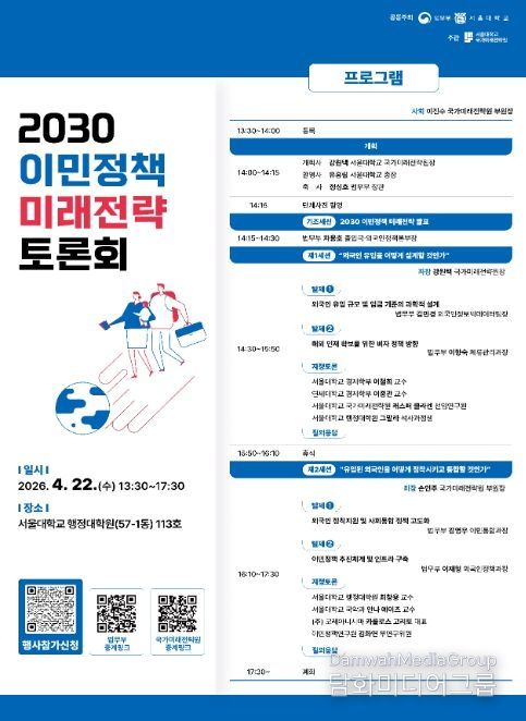 시민행정신문 강갑수 기자 | 법무부는 2026년 4월 22일 오후 2시 서울대학교 행정대학원에서 서울대학교(총장 유홍림)와 공동으로'2030 이민정책 미래전략'토론회를 개최했다.