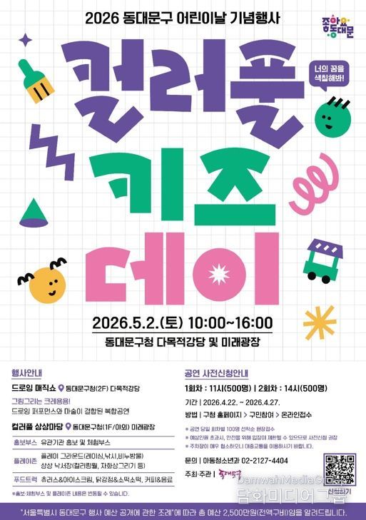 먼저 어린이날을 기념해 5월 2일 동대문구청 2층 다목적강당 및 1층 미래광장에서 2026년 어린이날 기념행사 '컬러풀 키즈데이'를 개최한다.