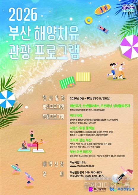 시민행정신문 강갑수 기자 | 부산시는 오는 5월 1일부터 10월까지 매주 토·일요일에 부산의 7개 해수욕장(해운대, 송정, 광안리, 송도, 다대포, 일광, 임랑)과 동백섬 일원에서 '2026 해양치유 관광 프로그램'을 운영한다고 밝혔다.