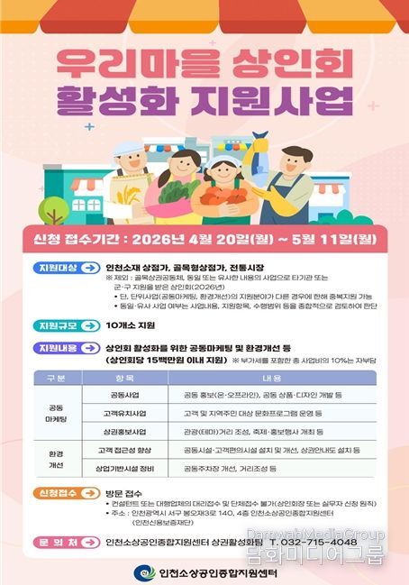 시민행정신문 이세훈 기자 | 인천광역시는 지역 상권의 자생력 강화와 골목경제 활성화를 위해 ‘2026년 우리마을 상인회 활성화 지원사업’을 본격 추진한다고 밝혔다.