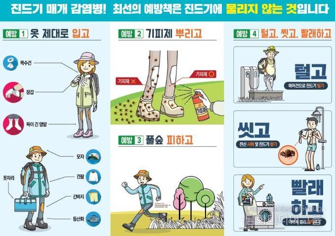 이에 시는 △야외활동 시 긴팔·긴바지·긴양말 착용하기 △진드기 기피제 사용하기 △풀밭에 옷을 벗어두거나 바로 앉지 말고, 돗자리 사용하기 △귀가 후 즉시 샤워 및 세탁 등 예방수칙 준수를 권고하고 있다.