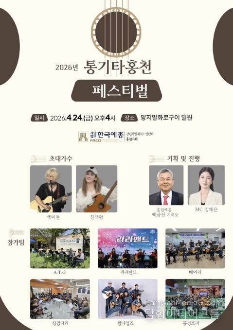 시민행정신문 기자 | (사)한국예총 홍천지회가 주관하는 2026 통기타 홍천 페스티벌이 오는 4월 24일 오후 4시 홍천 양지말화로구이 일원에서 열린다.