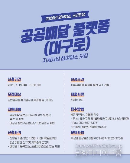 시민행정신문 강갑수 기자 | 대구 달서구는 신규 외식업소의 조기 정착과 경영 안정화를 돕기 위해 ‘2026년 외식업소 스타트업 공공배달 플랫폼 지원사업’을 추진한다.