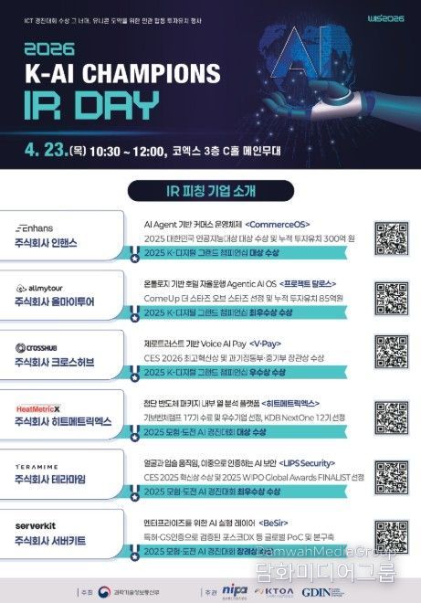 시민행정신문 이세훈 기자 | 과학기술정보통신부는 정보통신산업진흥원, 한국통신사업자연합회와 함께 4월 23일 서울 코엑스에서 ‘2026 K-AI Champions IR Day’을 개최했다고 밝혔다.