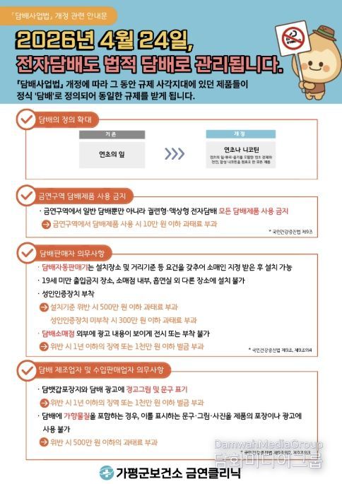시민행정신문 기자 | 가평군보건소는 '담배사업법' 개정에 따라 이달 24일부터 담배 규제가 대폭 강화된다고 밝혔다.