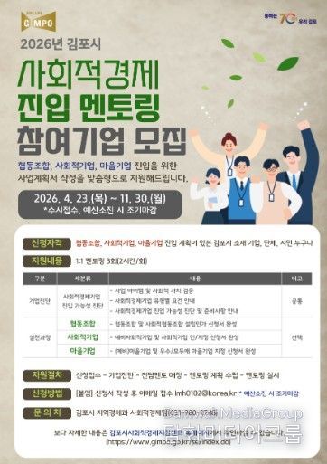 시민행정신문 이세훈 기자 | 김포시는 협동조합, 사회적기업, 마을기업 등 사회적경제기업 진입을 지원하기 위해 ‘2026년 김포시 사회적경제 진입 멘토링’ 참여기업을 오는 11월 30일까지 수시 모집한다.