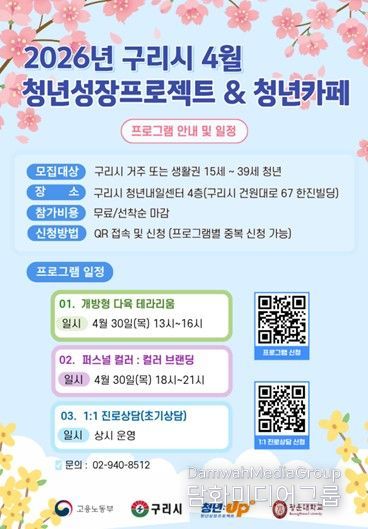 이번 4월 프로그램은 구리시에 거주하거나 생활권을 둔 15세부터 39세까지의 청년을 대상으로 하며, 구리시 청년내일센터 4층에서 진행된다. 참가비는 무료이며 프로그램별 중복 신청이 가능하다. 다만 모집은 선착순으로 마감된다.