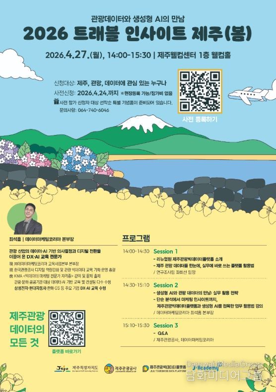 시민행정신문 이세훈 기자 | 제주특별자치도와 제주관광공사(사장 고승철)는 오는 27일 제주웰컴센터에서 관광사업체, 공공기관, 학계 등 관광과 데이터에 관심 있는 분들을 대상으로 데이터 기반 의사결정을 지원하기 위한 ‘2026 트래블 인사이트 제주(봄)’ 세미나를 개최한다고 23일 밝혔다. 이번 세미나에선 새롭게 개편한 제주관광 빅데이터 플랫폼(data.ijto.or.kr)의 활용 방안을 소개하고, 생성형 인공지능(AI)과 관광데이터를 결합한 실무 활용 전략을 공유한다.