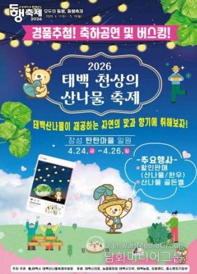 시민행정신문 기자 | 태백시는 오는 24일 오후 6시부터 장성탄탄마당(장성중앙시장 일원) 중앙무대에서‘2026 태백 천상의 산나물 축제’ 개막행사를 진행한다고 밝혔다.