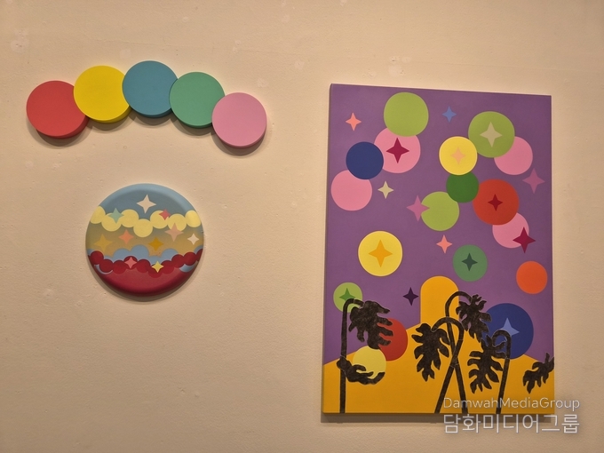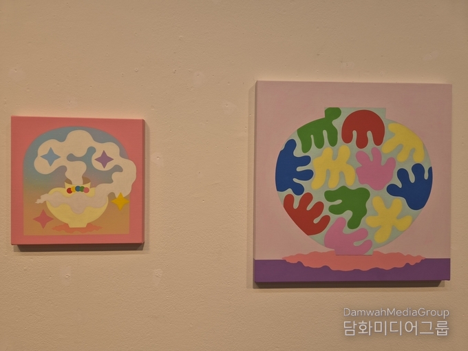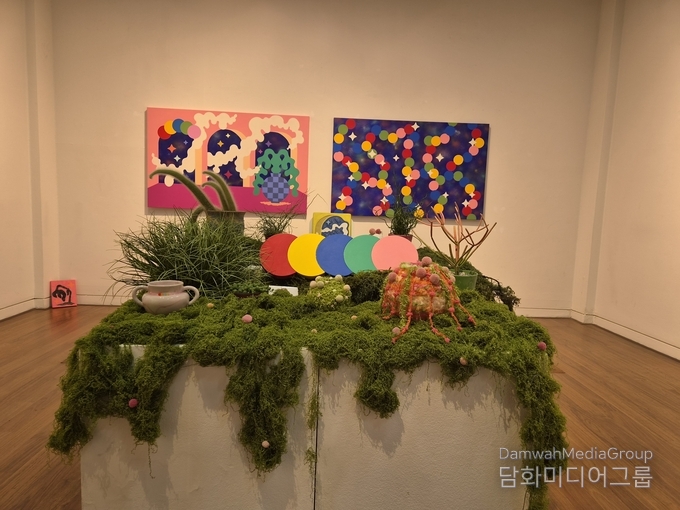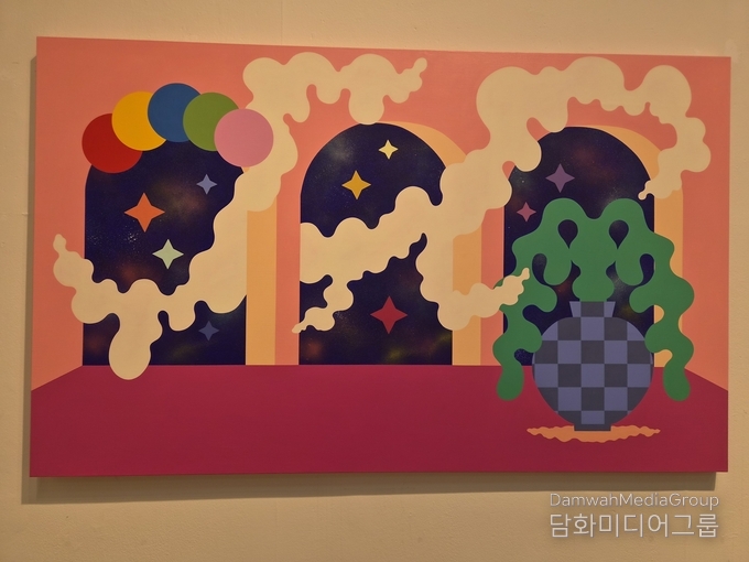 전시장에 놓인 이미지들은 선명한 색면과 반복되는 원형, 그리고 유기적으로 변형되는 꿈의 형상으로 구성된다. 아치형 창 너머로 펼쳐진 우주적 배경은 내면과 외부 세계 사이의 경계를 암시하며, 화면 위에 부유하는 색채의 구들은 기억의 단위이자 감정의 입자로 읽힌다. 이때 식물의 형태는 성장과 소멸, 그리고 변형을 동시에 내포하는 존재로서, 상실 이후에도 지속되는 생의 흐름을 상징한다.