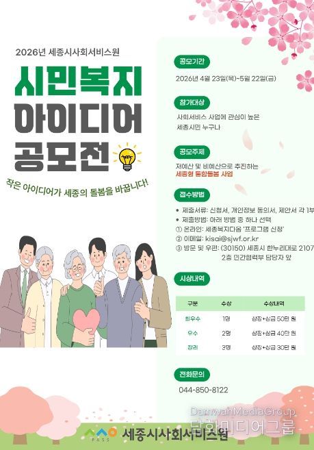 시민행정신문 강갑수 기자 | 세종시사회서비스원은 시민의 일상 속 경험과 참신한 제안을 바탕으로 지역 복지 문제를 함께 해결하기 위해 ‘2026년 시민복지 아이디어 공모전’을 개최한다고 밝혔다.