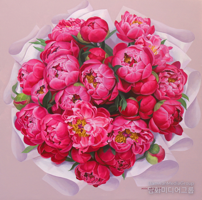 이번 전시에서 작가는 ‘기원’이라는 비가시적 감각을 회화의 구조로 풀어낸다. 위에서 내려다보는 꽃의 시점은 밖에서 시작해 안으로 향하는 기원의 행위와 맞닿아 있으며, 관객을 단순한 감상자가 아닌 내부로 진입하는 존재로 이끈다. 관객은 꽃을 바라보는 데서 나아가 그 내부로 이동하며, 어느 순간 작품에 말을 건네는 주체로 전환된다. 이때 꽃은 재현의 대상이 아니라 기원이 머무는 중심으로 기능한다.