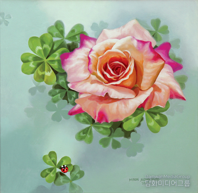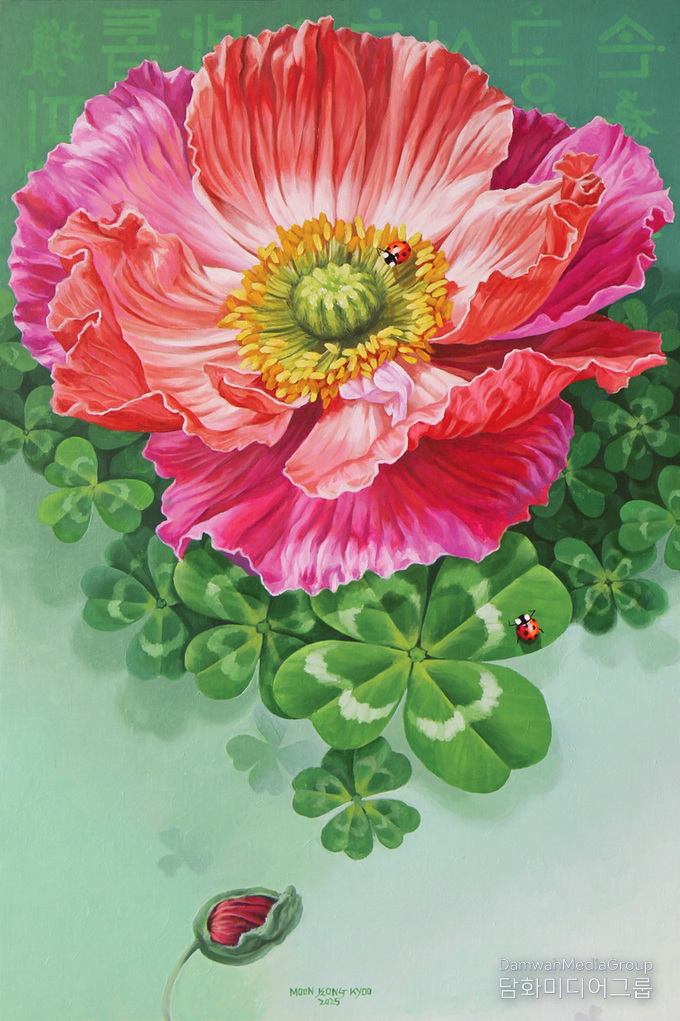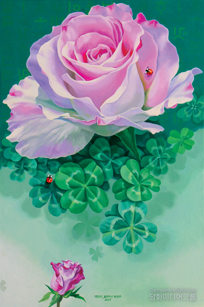 확대된 꽃의 스케일은 감상의 거리를 지우고 깊은 몰입을 유도하며, 만개한 꽃과 봉오리가 공존하는 장면은 ‘진행 중인 시간’과 열려 있는 상태를 드러낸다. 반복되는 크로버는 규칙과 변주의 리듬 속에서 삶의 구조와 가능성을 상징하고, 무당벌레는 기원을 전달하는 ‘속삭임’의 매개로 작동한다. 또한 훈민정음 해례본은 한국적 정체성과 문화적 감각을 환기하는 요소로 자리한다.