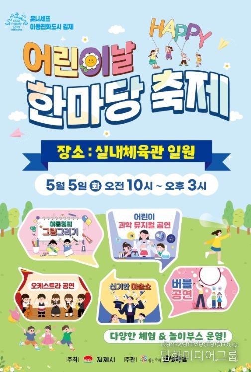 시민행정신문 강갑수 기자 | 김제시(시장 정성주)는 제104회 어린이날을 맞아, 오는 5월 5일(화) 실내체육관 주차장 일원에서 어린이날 한마당 축제를 개최한다고 밝혔다.